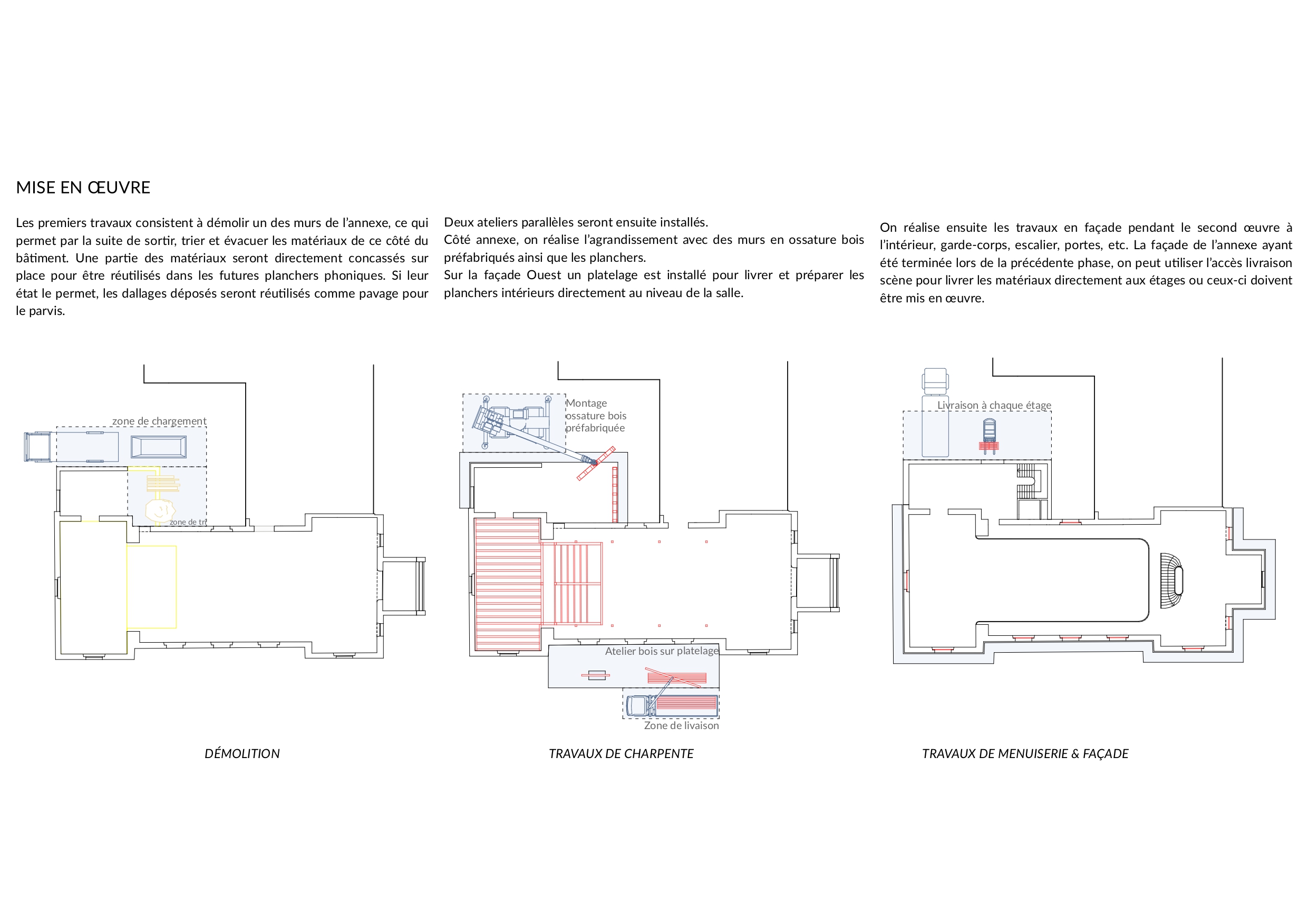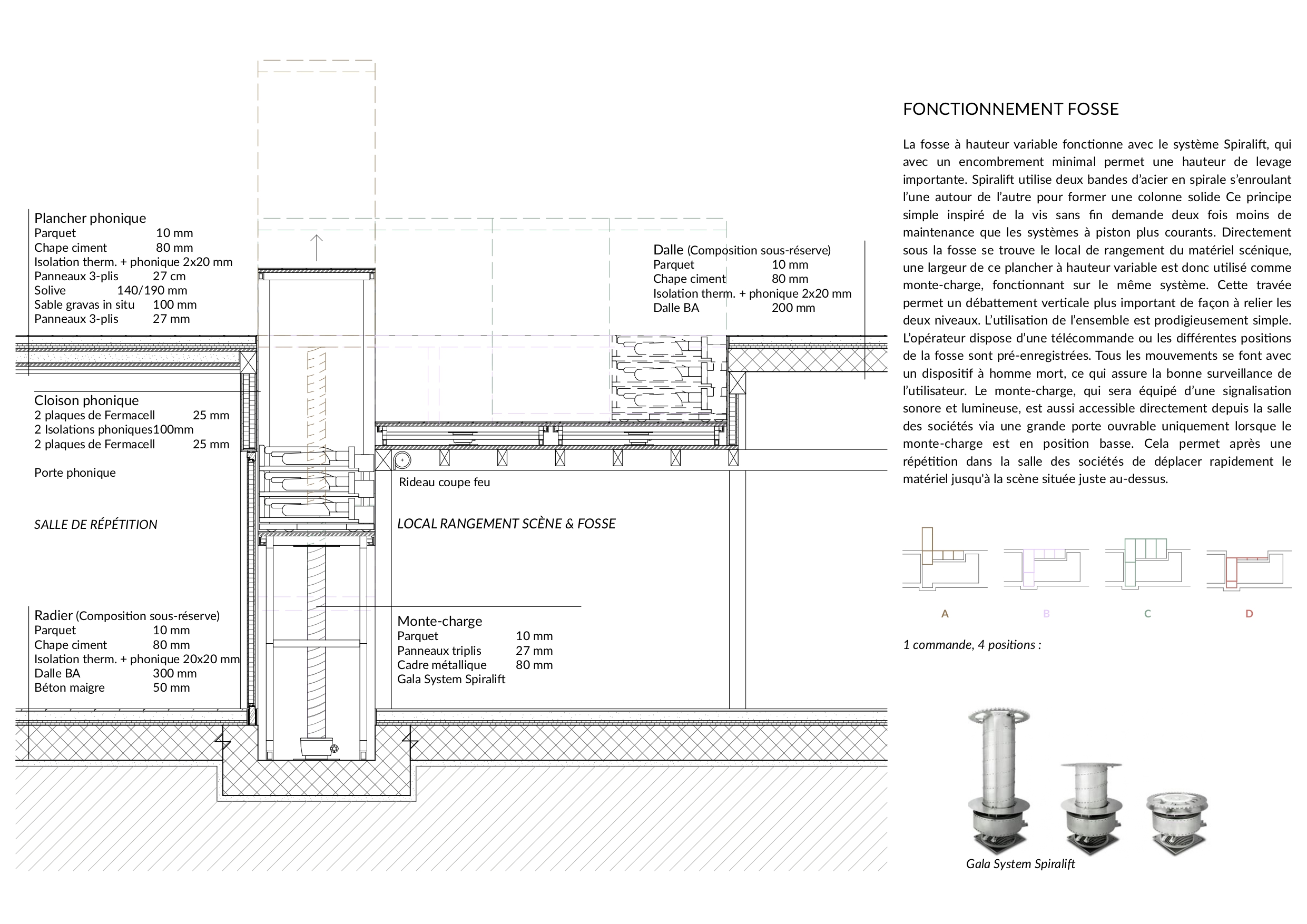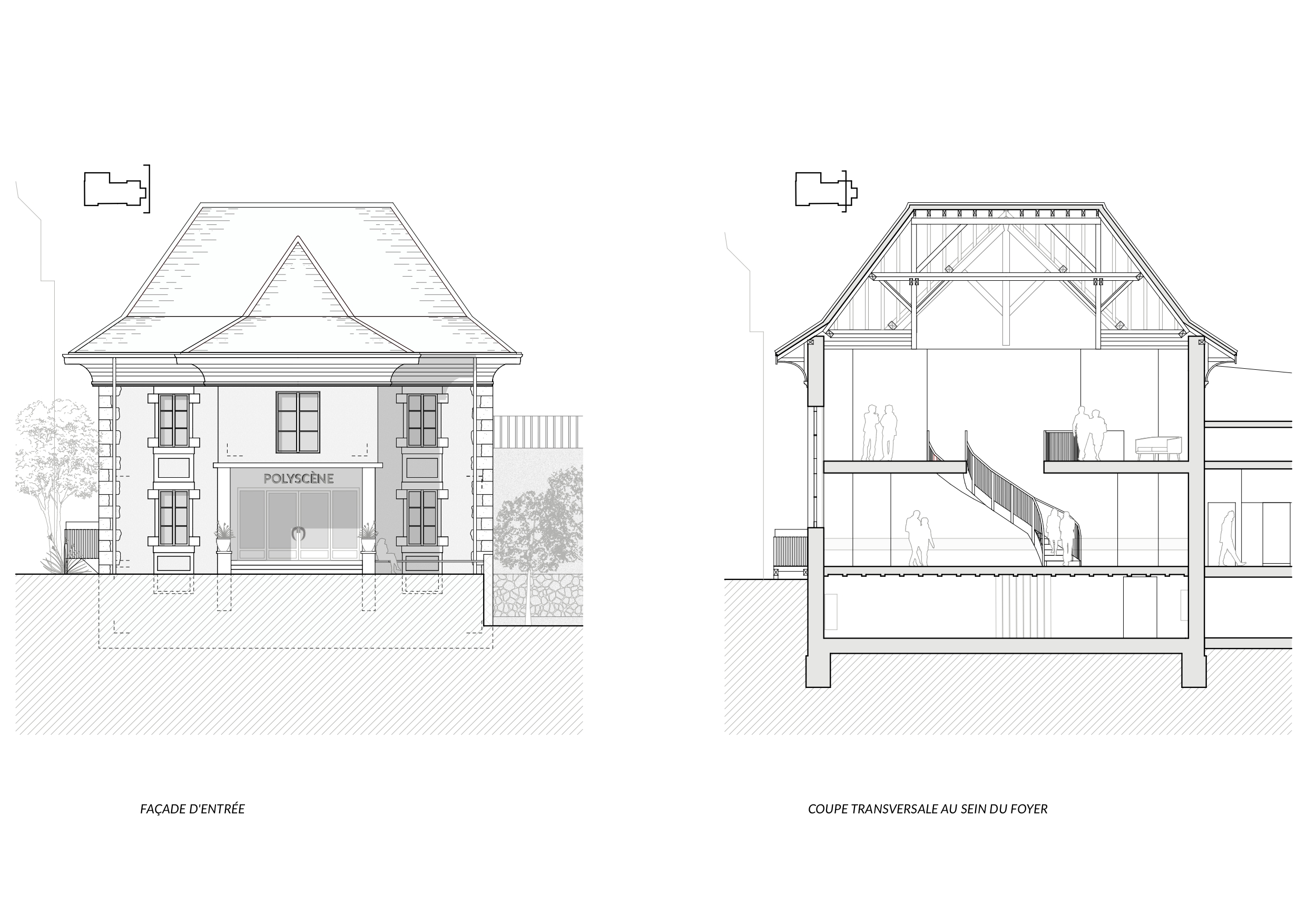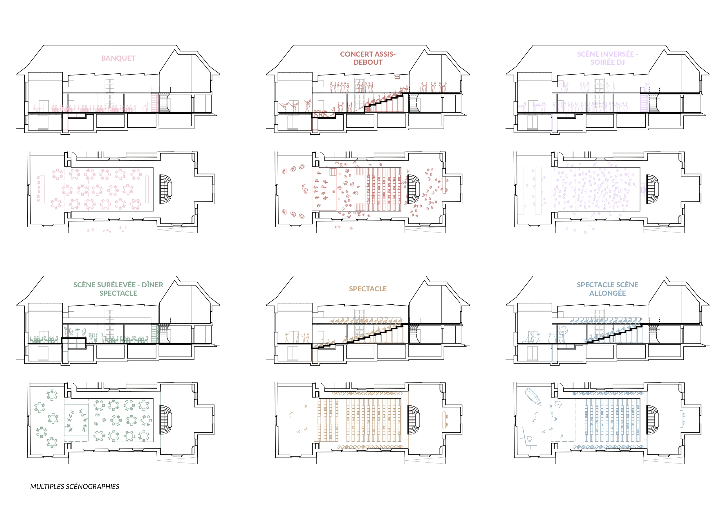 Le projet s’organise depuis le foyer, développé sur deux niveaux et relié par un escalier central qui distribue également les balcons. Ces derniers viennent couronner la salle principale, un espace désormais modulable, où scène et salle peuvent ne faire qu’un. Loin d’une configuration classique, une fosse à hauteur variable permet de multiples scénographies, offrant aux artistes comme au public une expérience renouvelée et évolutive.