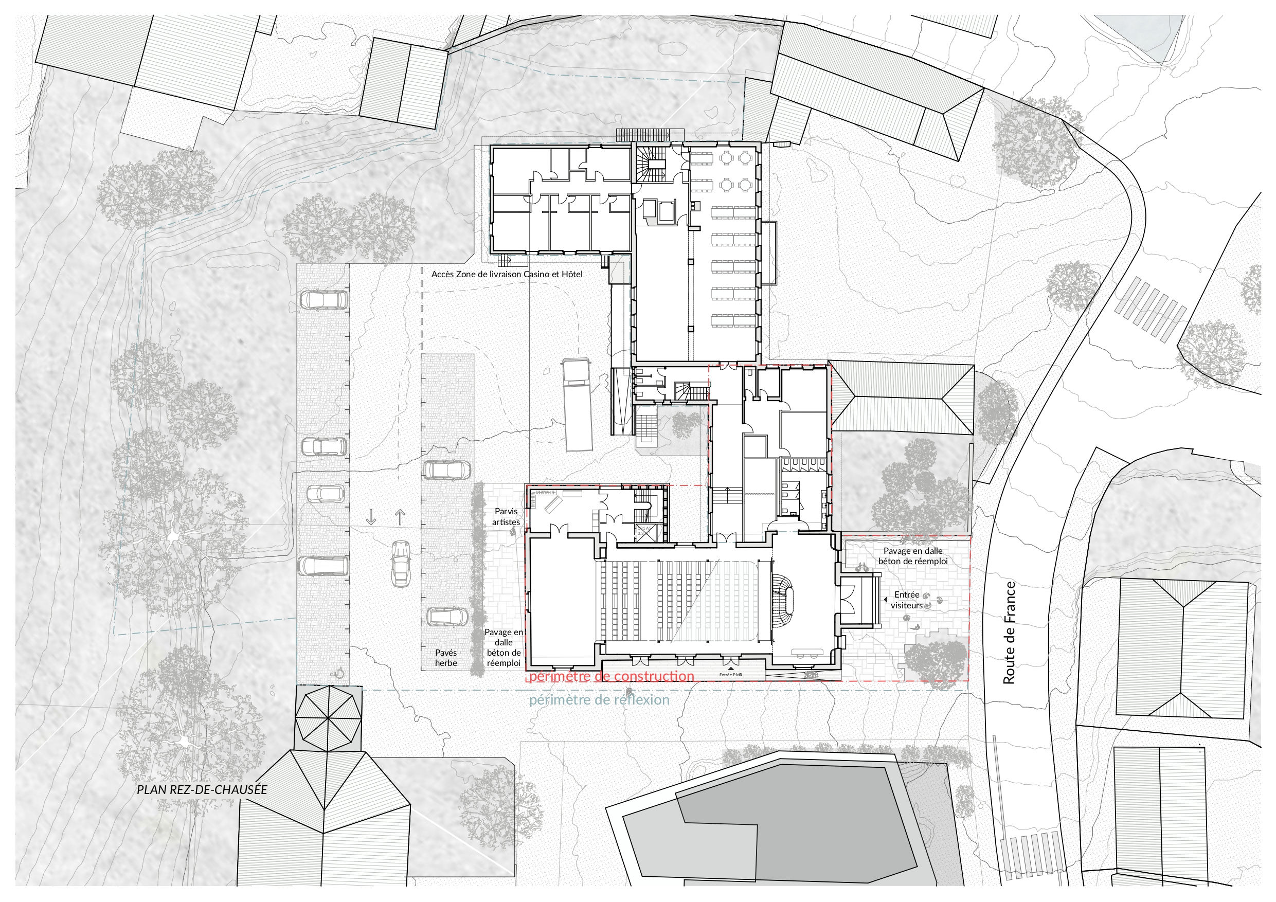 Le parcours des artistes, pensé comme une séquence autonome, s’articule depuis l’extérieur jusqu’à la scène : préparation, échauffement, représentation. Cette circulation indépendante du public garantit fluidité́ et intimité́ des usages.