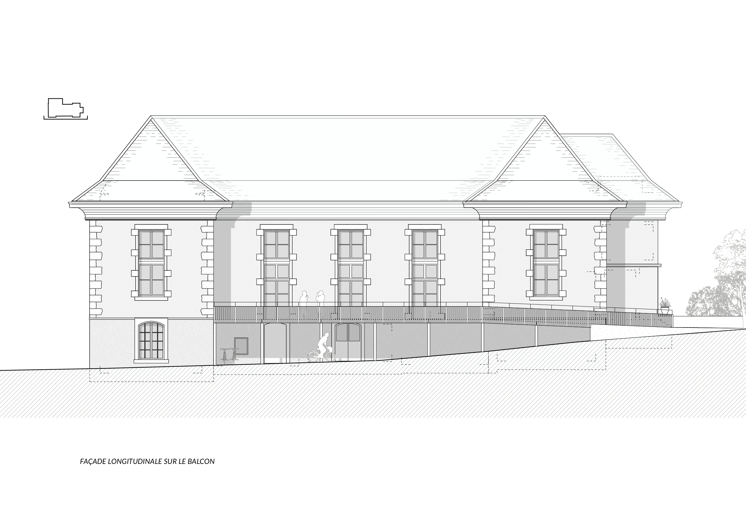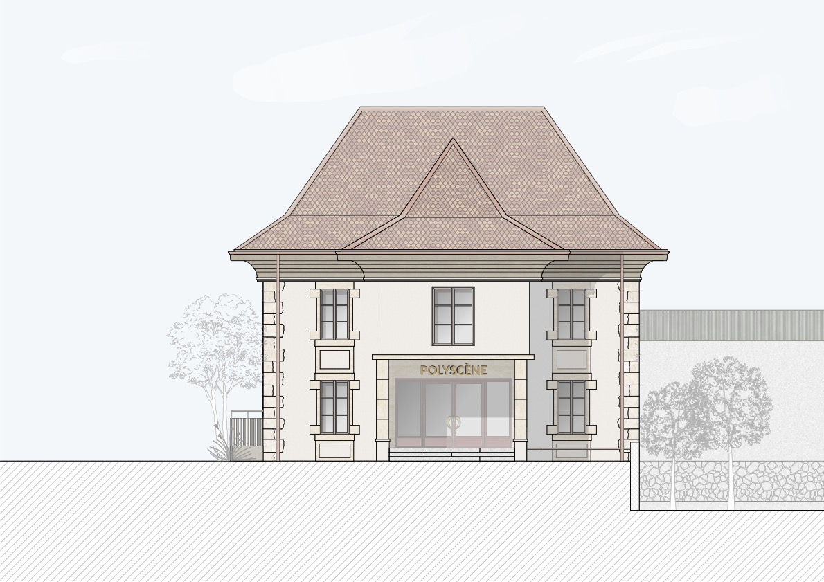 POLYSCÈNE puise dans la mémoire du lieu pour en proposer une lecture renouvelée. Les ouvertures préexistantes retrouvent une présence affirmée : elles s’étirent désormais jusqu’au sol, redonnant souffle et verticalité à la façade. L’apparition d’un balcon et la réinterprétation du crépi d’origine mettent en valeur les encadrements de fenêtres ainsi que les chainages d’angle en pierre, témoins du caractère patrimonial du bâti.