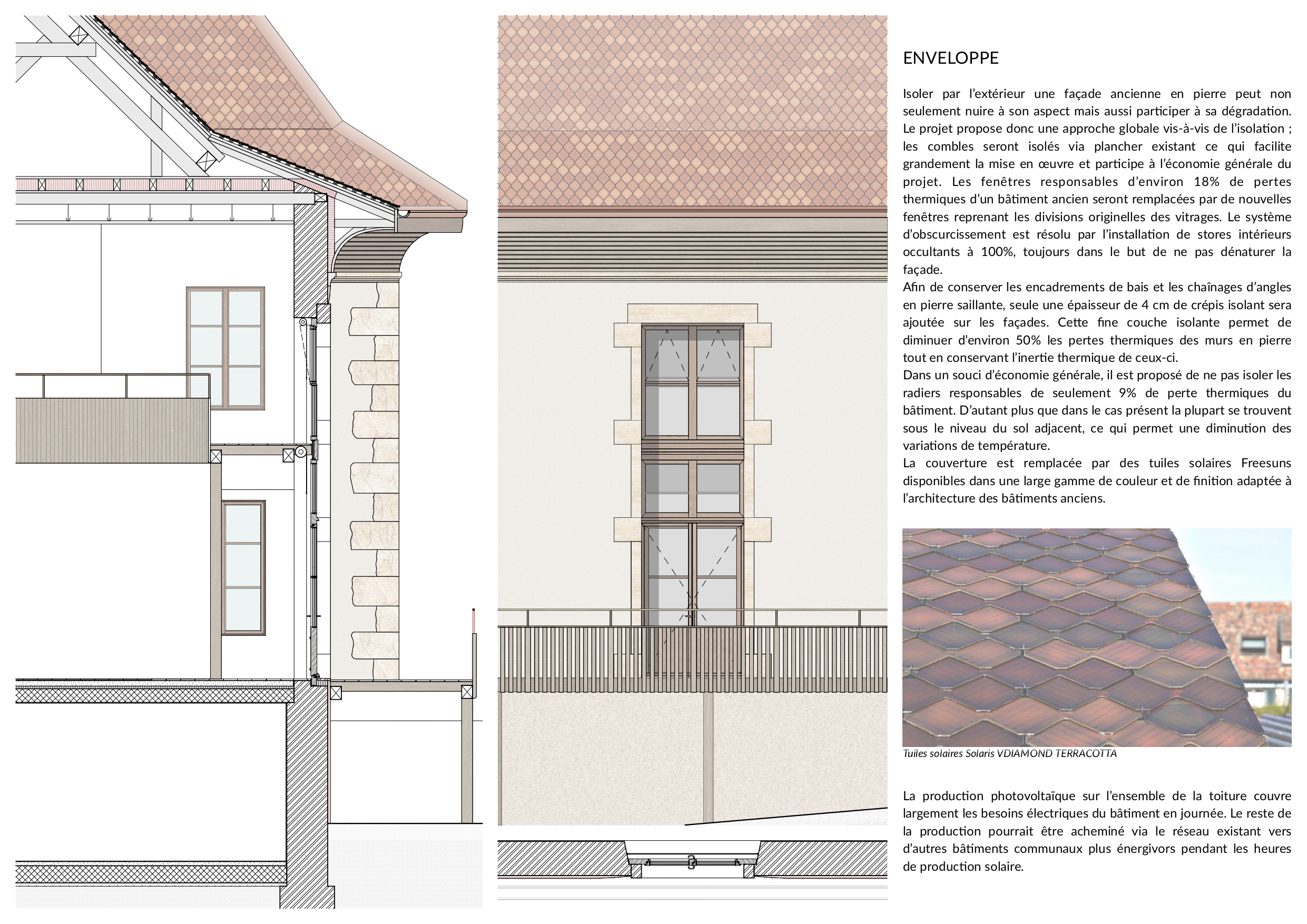 La rénovation du bâti repose sur une mise en œuvre rationnelle : chaque intervention nouvelle reprend le principe constructif en structure bois poteaux- poutres. Le parti architectural vise à préserver l’aspect traditionnel du bâtiment tout en répondant aux exigences contemporaines. Les tuiles solaires, choisies dans une teinte terracotta évoquant les couvertures anciennes, assurent la transition entre patrimoine et innovation. Enfin, le crépi, à la fois isolant et respectueux de l’esthétique d’origine, participe à la cohérence d’ensemble sans altérer l’identité́ du lieu.